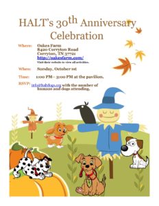 HALT is celebrating 30 years! We want to celebrate all of our volunteers, HALT Graduates and their families, and those that have supported the program over the years. We look forward to the “where are they now” with the graduates and their families. Oakes Farm has hay rides, a corn maze, pumpkin patch, and lots of other family friendly activities to enjoy the day. Dogs are welcome on leash (please, no retractable leashes). Cupcakes for the humans and special treats for the dogs will be provided. Oakes does have concession stands on site with food for purchase.