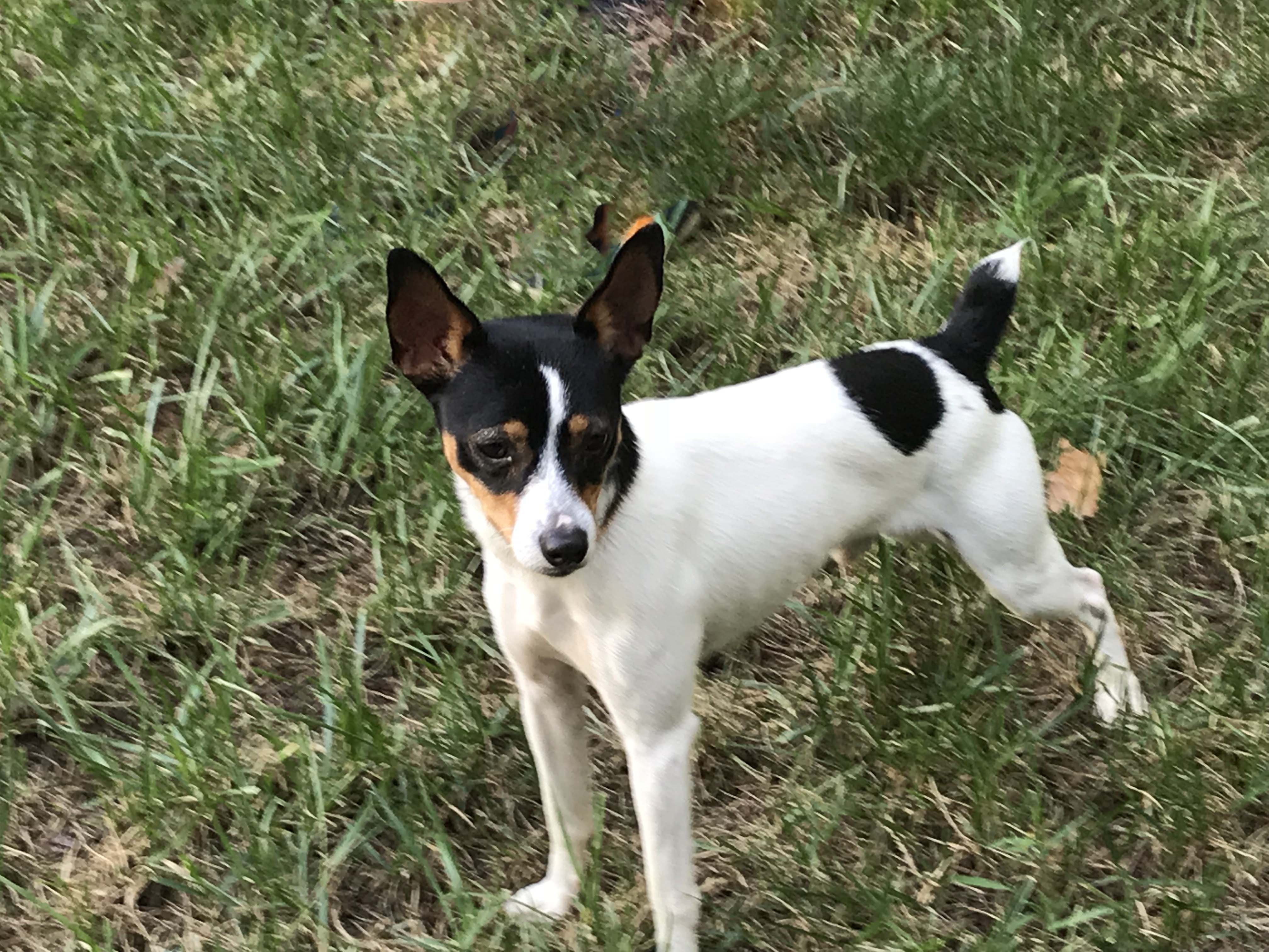 George is a male rat terrier mix, around 2 years old and 12 lbs. He can be a little shy at first but warms up quickly. Once he does, he loves giving kisses.